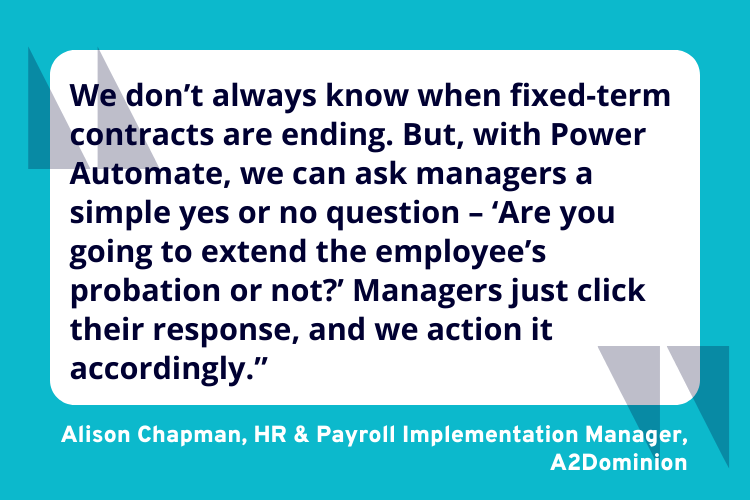 Other areas under consideration include fixed-term contract alerts and sickness triggers. “We don’t always know when fixed-term contracts are ending. But, with Power Automate, we can ask managers a simple yes or no question – ‘Are you going to extend the employee’s probation or not?’ Managers just click their response, and we action it accordingly.”