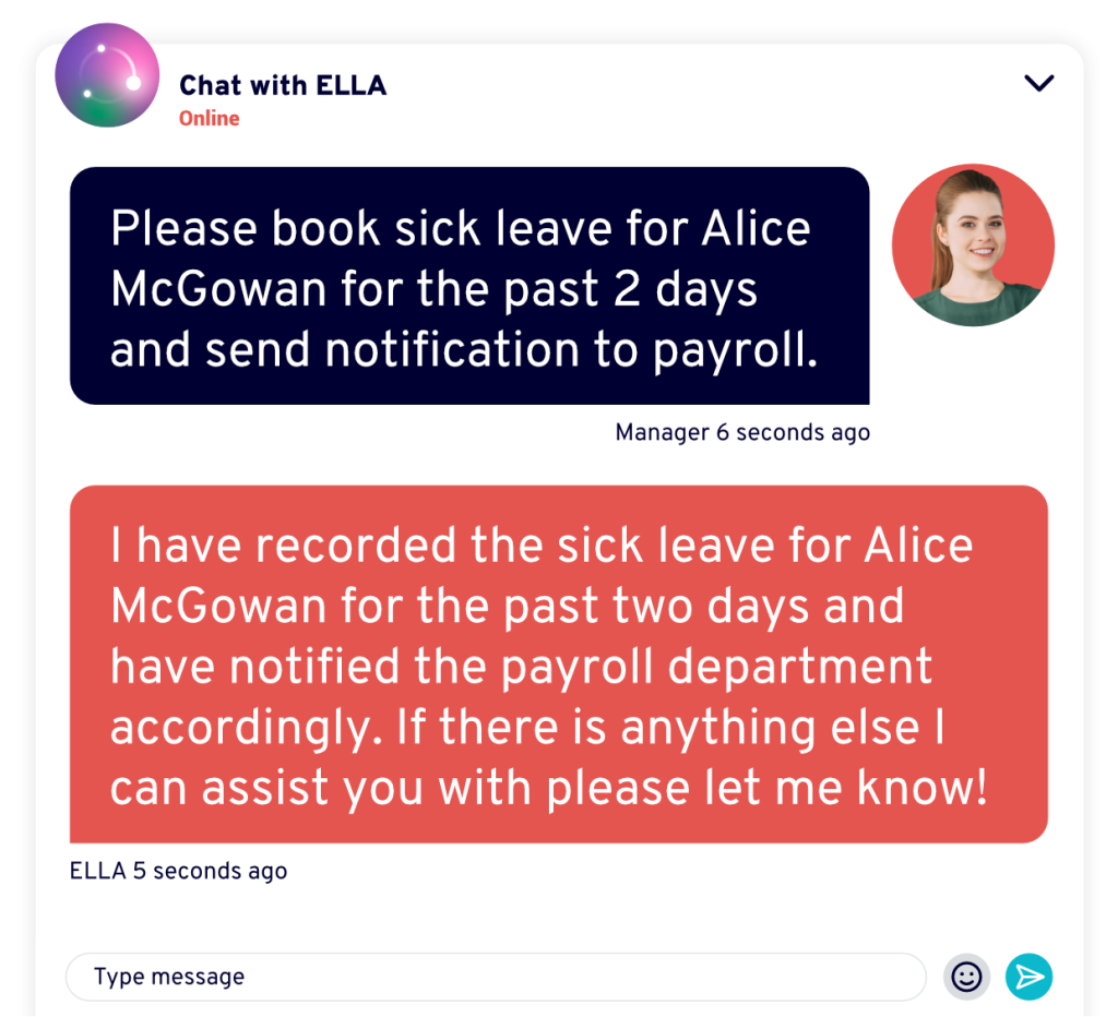 - Sickness management – “Please book sick leave for Alice McGowan for the past 2 days and send notification to payroll”